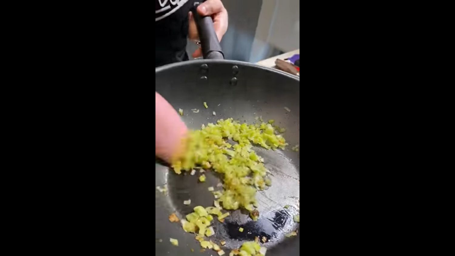 El movimiento que hace Dabiz Muñoz es picar el puerro como si fuese cebolla para un sofrito, previamente lavado, para poder pocharlo en una sartén. En la sartén lo que haremos será poner un poquito de aceite de oliva y lo colocaremos al fuego para freír el puerro picado.