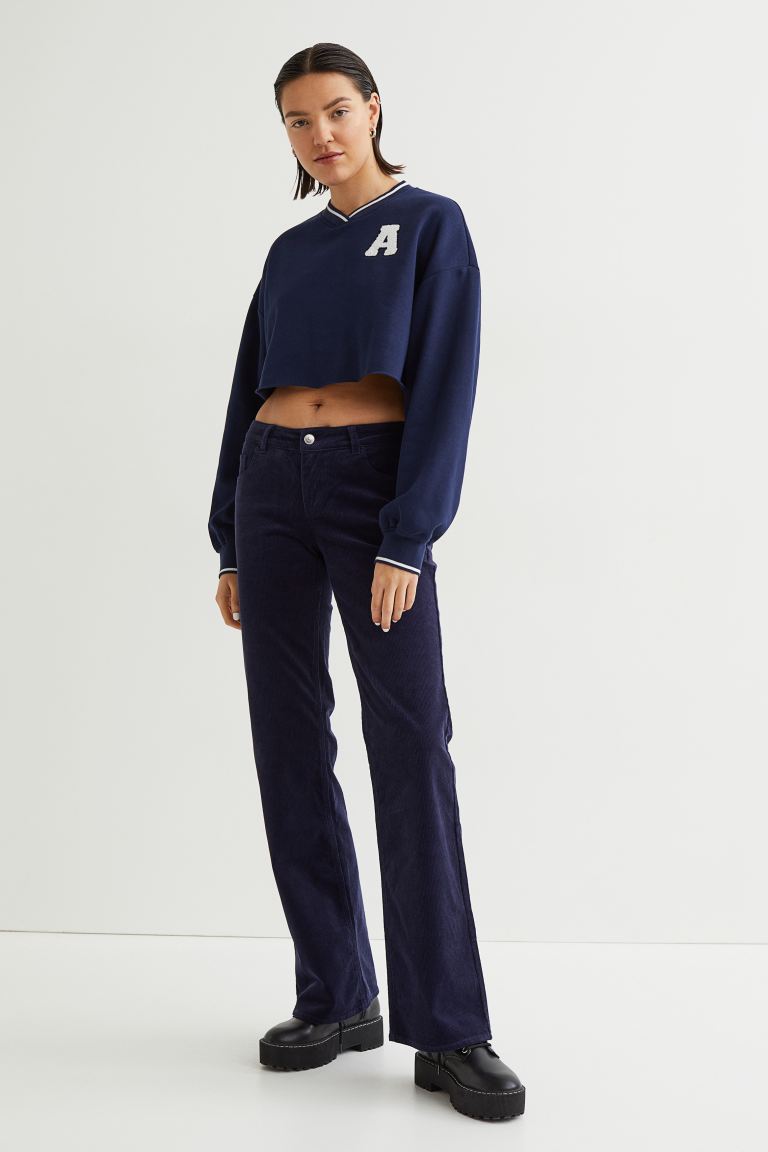 El diseño de tendencia del momento, una sudadera de estilo clásico con cuello en pico, pero con un corte cropped, con hombros caídos, puños de punto elástico de canalé y bajo enrollado porque no está rematado.