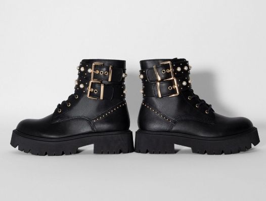 Hay que reconocer que el anterior modelo, por muy llamativo que sea, no es una pieza que podamos utilizar a diario, sino que está confeccionada para momentos puntuales. Por mucho que nos duela, en nuestro armario debe existir un equilibrio entre las prendas especiales y las básicas para utilizar día sí, día también. Dentro de esta segunda categoría se encuentran estos botines planos detalles perlas y tachas que puedes comprar en la página web de Bershka y en sus establecimientos por tan sólo 45,99 euros. Lo más llamativo son los detalles de perlas en las lengüetas, además de su plataforma ancha y su cierre con cordones.