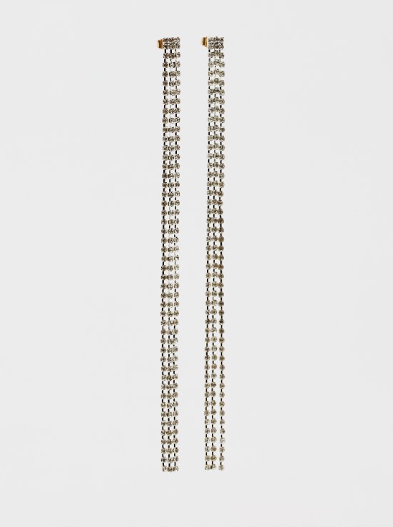 En otoño buscamos más elegancia y por eso estos pendientes son ideales. Son unos aros colgantes de tiras de strass, una opción segura para cualquier look de fiesta. La composición con que está fabricado es 55% latón, 40% vidrio y 5% hierro. El cierre es tipo mariposa. El precio, como te mencionamos, en Pull&Bear es de 5,99 euros. A continuación te mostramos unos pendientes largos con piedras lilas.