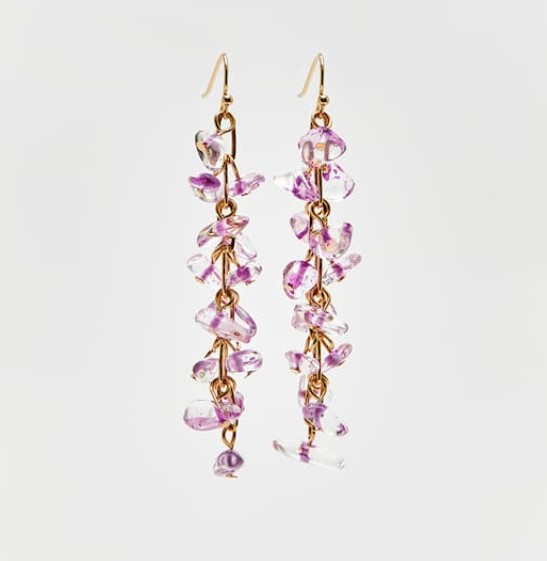 Si te gustan los pendientes de colores, estos de Pull&Bear son ideales. Son unos aros largos de piedras en color lila. Están elaborados con 60% cuarzo, 35% hierro y 5% latón. Se sujeta en la oreja a través de gancho curvado. El precio de venta es de 6,99 euros. A continuación te mostramos unos pendientes cascadas con piedras.