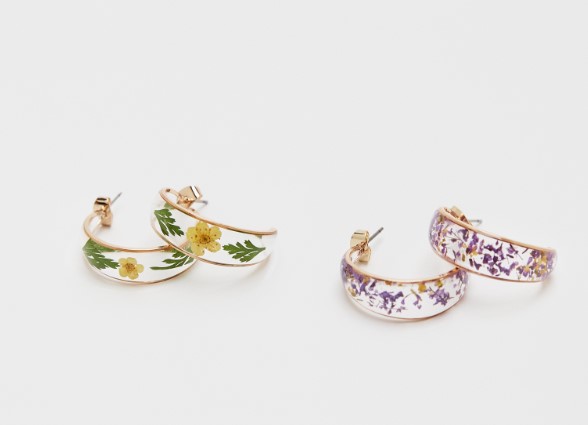Estos son unos pendientes tipo aro con diseño transparente y detalle de flores secas. Cuenta con cierre mariposa. Se trata de una opción muy original para elevar cualquier look. Están elaborados con 90% resina y 10% latón. El pack de 2 pendientes los consigues en Pull&Bear a 9,99 euros. A continuación te mostramos unos pendientes aros básicos.