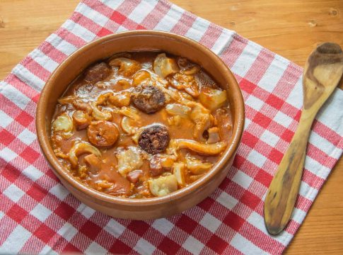 Su receta tiene como ingredientes principales diversas partes de la anatomía de la vaca, como son las vísceras, el morro y las patas. Estas son acompañadas por morcilla, chorizo y jamón. De esta mezcla, se obtiene un suculento manjar que suele servirse en una cacerola de barro. Una opción relativamente económica debido al coste de sus ingredientes, pero indiscutiblemente deliciosa.