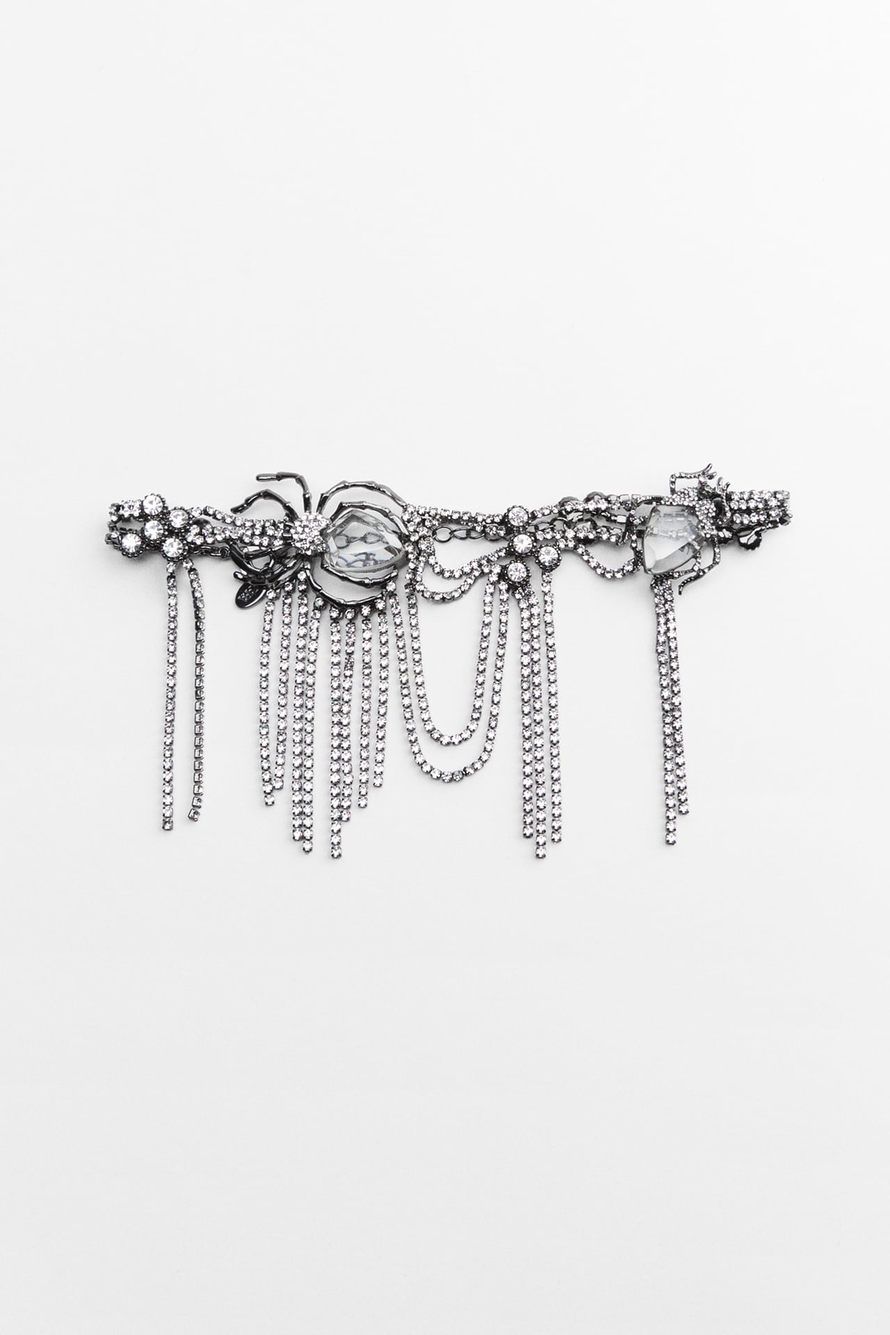 En Zara las joyas son más que accesorios o adornos para completar tu outfit. Son piezas de orfebrería que obedecen a la elegancia, son diseños creados para enaltecer la belleza que no conoce género y un ejemplo claro es éste choker de metales brillosos inspirado en las redes tejidas por los insectos arácnidos con una ilusión de telarañas centelleantes que cuelgan de la pieza y se ajusta perfectamente al cuello con cierre mosquetón. Está gargantilla moderna puede ser usada por mujeres y hombres de todas las edades que quieran resaltar su gusto por las piezas de joyería auténticas que es imposible dejar pasar desapercibidas.