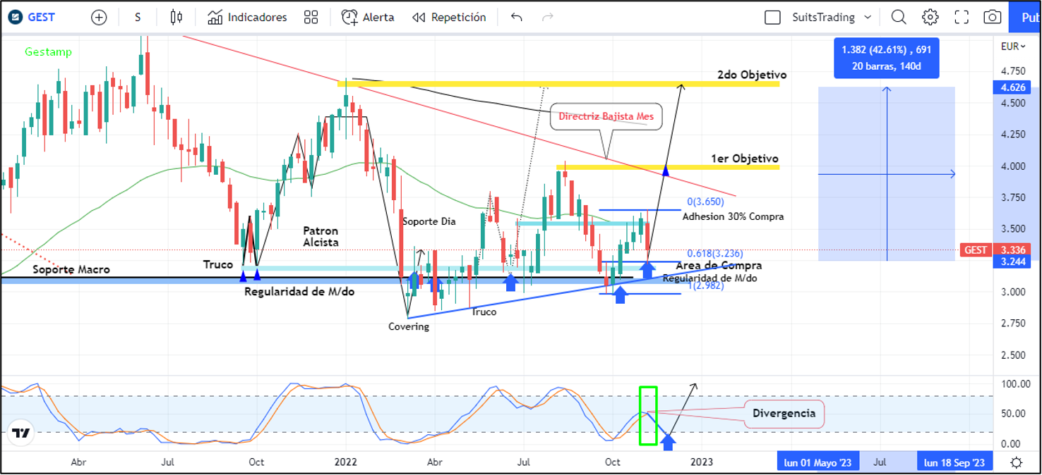 Este martes con la entrega de estos resultados, la acción abrió a la baja dando como primer impacto una pérdida del valor cercano al -11,2% generando un sentimiento desconcertante para muchos analistas e inversores que, esperarían un impacto al alza ante tales resultados financieros. La razón, es que las acciones de Gestamp desarrollaron una micro tendencia alcista desde el 30 de septiembre, la cual en algún momento debería buscar regularidad del mercado en el 61,8 de retroceso de Fibonacci, movimiento especulativo que hoy visitó al punto exacto y que, según inversionistas de la talla de Warren Buffett, conocidos como «contrarians», este tipo de movimientos deberían reflejar una oportunidad de compra de las acciones de Gestamp.