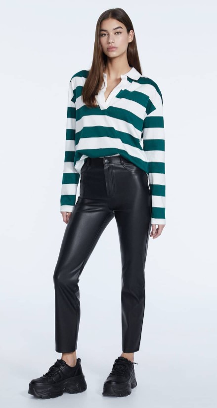 Este es otro pantalón efecto piel de Stradivarius. Se trata de un diseño ajustado a la piel, de tiro medio, con cuatro bolsillos. Tiene cierre con cremallera y botón. Está confeccionado con 50% poliéster y 50% poliuretano. Disponible solo en negro y en las tallas que van desde el 32 al 44. El precio de venta es de 29,99 euros.