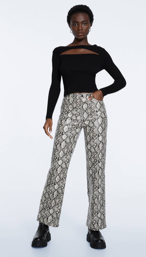 Este es otro pantalón efecto piel de Stradivarius, con 5 bolsillos y pernera recta. Tiene cierre con cremallera y botón. El estampado es de serpiente, confeccionado con 50% poliuretano, 46% poliéster, 4% elastano. Disponible en las tallas que van desde el 32 al 44. El precio de venta es de 29,99 euros.