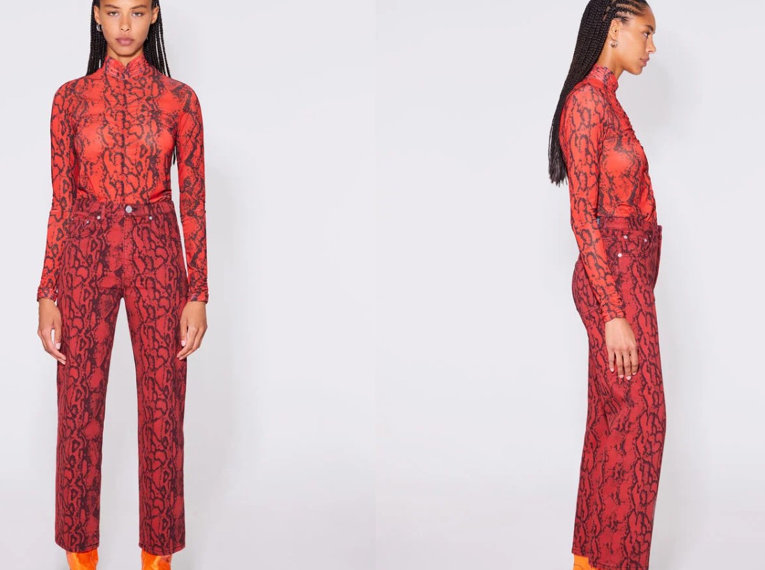 Este pantalón vaquero de Bimba y Lola es estilo Straight Cropped, con print pitón en color rojo. Se trata de un modelo de corte recto, tiro alto y con cinco bolsillos. El cierre es con cremallera y trabilla para el cinturón. El 20% de las fibras utilizadas para confeccionar la prenda es reciclada. Lo consigues por 125 euros, y están disponibles desde la talla 34 al 42.