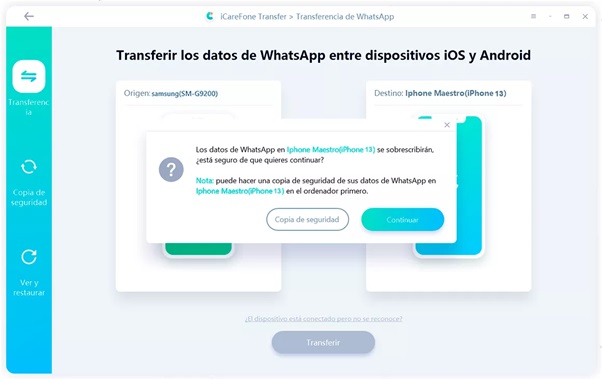 Esto sobrescribirá los datos de WhatsApp en su iPhone. Simplemente cambie a la función «Transferir y fusionar datos de WhatsApp» si desea fusionar los datos de WhatsApp de su iPhone y Android.