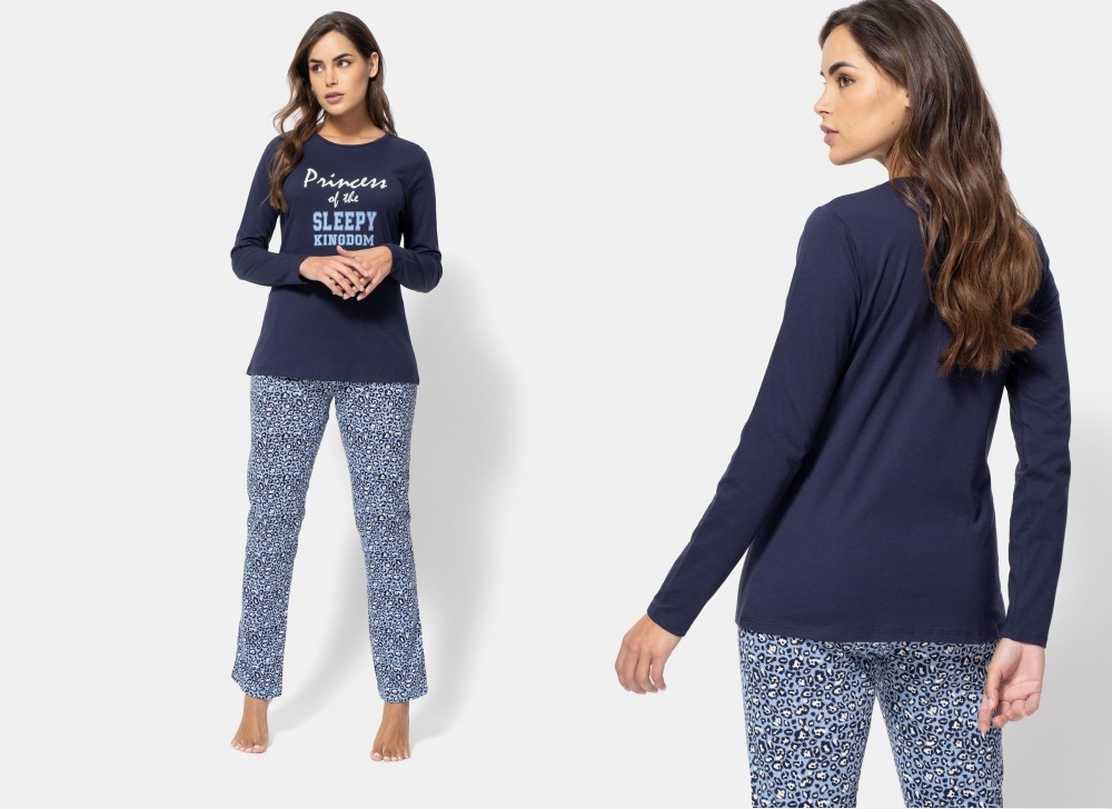 Es un diseño básico, cómodo, con estampados, manga larga, y pantalón largo. Ambas piezas se han fabricado en algodón 100%.