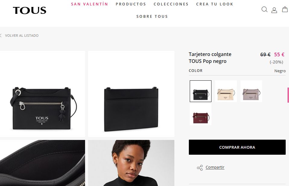 El tarjetero colgante de la colección Pop de poliuretano con acabado saffiano en color negro. Cuenta con un asa larga de bandolera desmontable y ajustable. 3 compartimentos planos para tarjetas y un bolsillo con cremallera. El tarjetero cuenta con un detalle de colgante de oso. Si desean comprarlo tienen que entrar a Tous por 55 €.