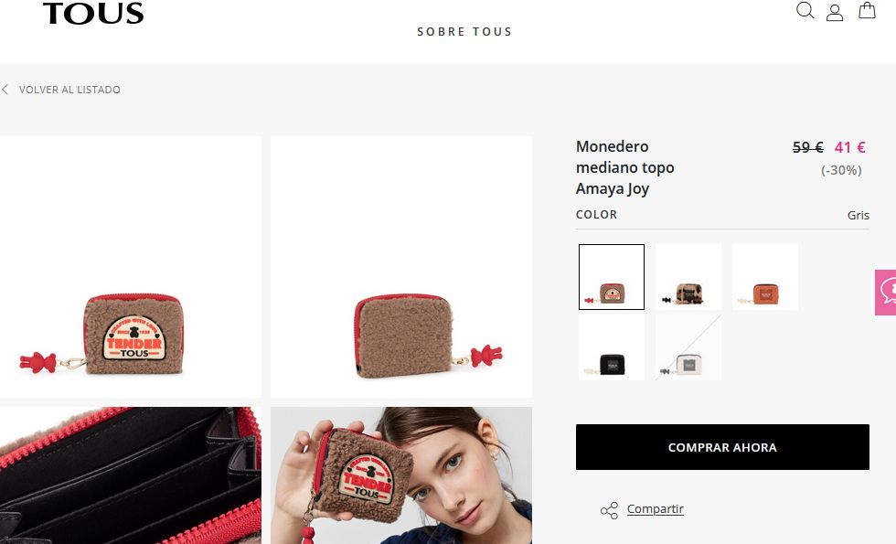 El monedero mediano TOUS Amaya Joy de borreguito sintético en color topo con parches decorativos que aportan un estilo juvenil y desenfadado. Cuenta con un cierre con cremallera e incluye un bonito detalle de oso colgante. Este fantástico monedero de suave tacto se convertirá en un complemento ideal para este invierno. Entonces, si desean comprar esta prenda solo deben entrar a Tous por 41 €.