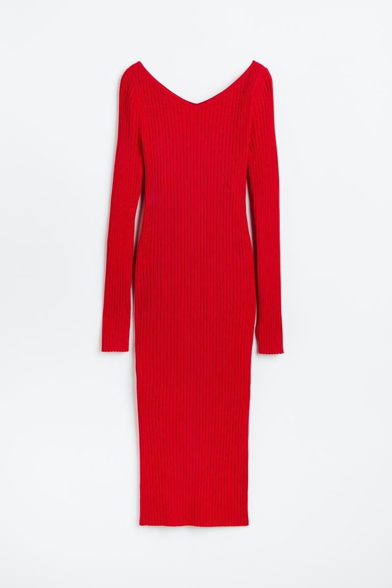 Los vestidos ajustados de canalé están en tendencia. En H&M puedes conseguir este modelo de corte midi hecho en punto de canalé suave, ajustado y entallado. Tiene un escote de pico en la parte de delante y en la espalda, y unas bonitas mangas extralargas con detalles de abertura en los puños. El bajo es recto, y está confeccionado en poliéster reciclado, viscosa y poliamida. Un vestido versátil que permite un montón de combinaciones. Hay tres colores: gris jaspeado, rojo o negro. Lo puedes tener por 29,99€.
