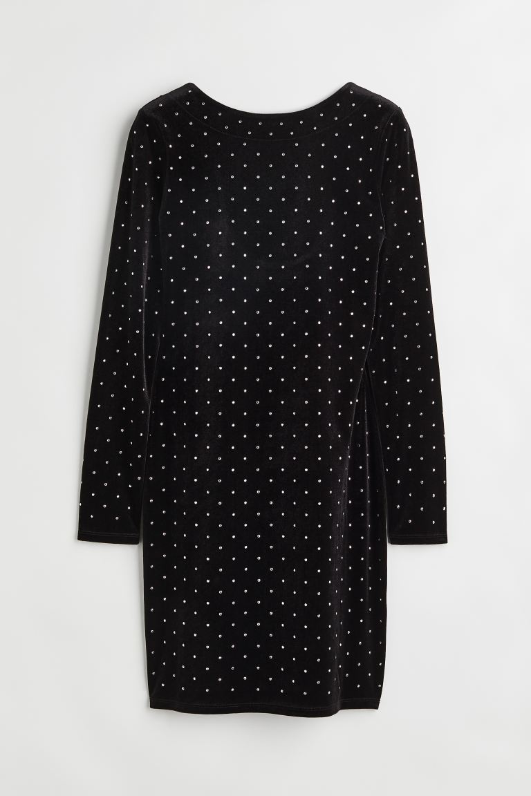 Otro vestido ideal recién llegado al catálogo de H&M es este diseño que resulta perfecto para días especiales. Es corto, con un escote amplio en la parte de delante y también en la espalda. Es de manga larga y con bajo recto. El corte es sencillo, pero resulta muy favorecedor y elegante, sobre todo si lo combinas con unos zapatos de fiesta y tus complementos más llamativos. Hay dos modelos, uno en negro con detalles brillantes de strass y otro en verde oscuro. El precio es muy tentador: solo 14,99 €.