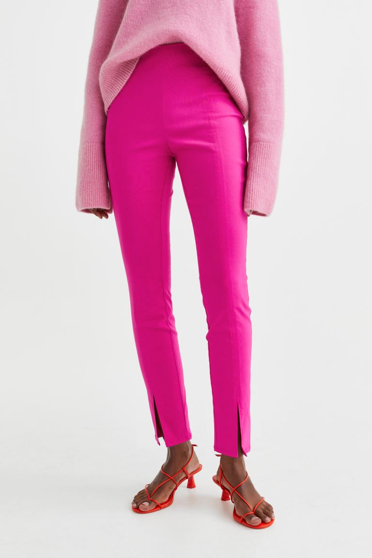 Si buscas un pantalón elegante y favorecedor para el día a día en la oficina, este diseño de H&M es ideal. Es de corte tobillero, con las perneras ajustadas con un detalle de abertura en la parte de delante. Es de talle alto con cierre de botón y cremallera oculta en un lateral. Está hecho en viscosa y poliéster, con un poco de elastano para un ajuste perfecto al cuerpo. Hay tres colores: cereza, verde, oscuro y negro. Combínalos con tus mejores blusas o con un jersey bonito. Su precio es de 19,99€.