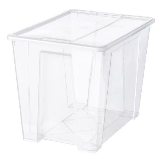Si lo que necesitas es una caja de plástico sencilla y resistente, y que tenga tapa, también la encuentras en IKEA. Esto modelo es de 57 x 39 x 42 cm y tiene capacidad para 65 litros.