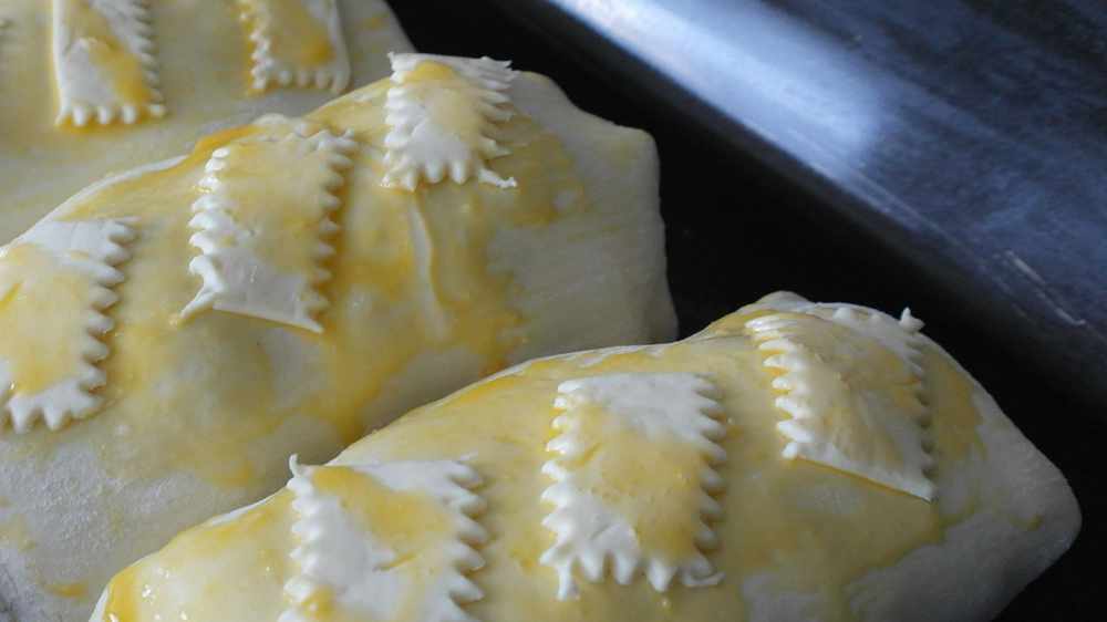 Cuando tengamos todos los lingotes de hojaldre formados, hacemos un pequeño agujero en cada uno de ellos para que sirva de chimenea. Después los pintamos con un poco de huevo batido y llevamos la bandeja al horno. Hay que hornearlo a 200ºC durante unos 15 minutos, o hasta que cada porción tenga un aspecto dorado. Una vez listos, retiramos del horno y esperamos unos minutos para que se temple y tome algo de firmeza.