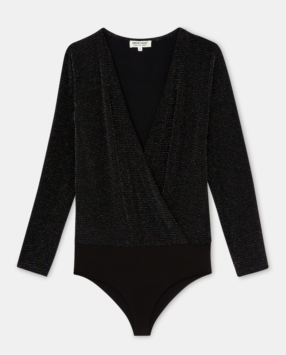 El body es una prenda muy favorecedora y muy versátil, ideal para estilismos elegantes y de fiesta. Este de El Corte Inglés es de color negro y tiene detalles de lurex brillante. El escote es cruzado en forma de pico, y la espalda es escotada con detalles cruzados, que lo hacen muy especial. Es perfecto para combinar con un pantalón de fiesta y conseguir un look de Navidad con mucho estilo. Es de poliéster y elastano y tiene un precio de 39,99€.