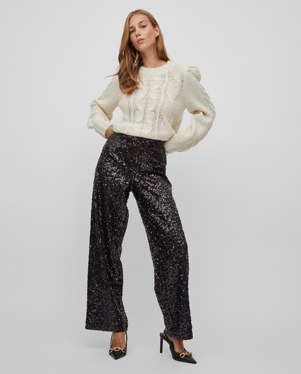 Si lo que buscas es un pantalón de fiesta muy especial, la marca Vila de El Corte Inglés nos ofrece este diseño recto, tan cómodo como elegante, de tiro alto, y todo cubierto de lentejuelas. Ofrece muchas posibilidades para combinarlo, simplemente deja volar tu creatividad. Hay un blazer a juego si buscas un total look brillante. Es de poliéster con un 5% de elastano para un ajuste óptimo al cuerpo muy favorecedor. Es de color negro y tiene un precio de 74,99€.