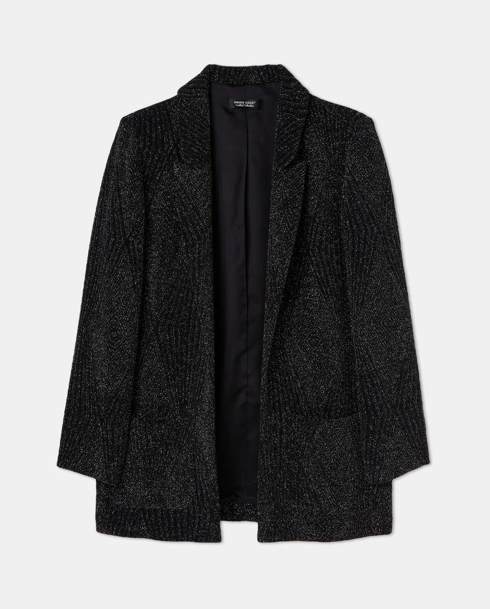 Un estilismo de fiesta no tiene por qué estar reñido con ir abrigada. Una forma elegante de no pasar frío es con una blazer como esta, de color negro, con brillos de lurex que le dan un aspecto único. Tiene un diseño clásico de solapas con muescas, y dos bolsillos laterales. Es abierta, sin botones, y puede convertirse en tu complemento ideal para las fiestas. Es ligeramente elástica para un mejor fit. Puedes hacerte con la tuya en El Corte Inglés por 59,99€.
