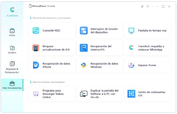 Del lado izquierdo en el menú principal, selecciona “Más Herramientas”. En la sección “Herramientas reparación y optimización” da clic en la opción “Convertir HEIC”.