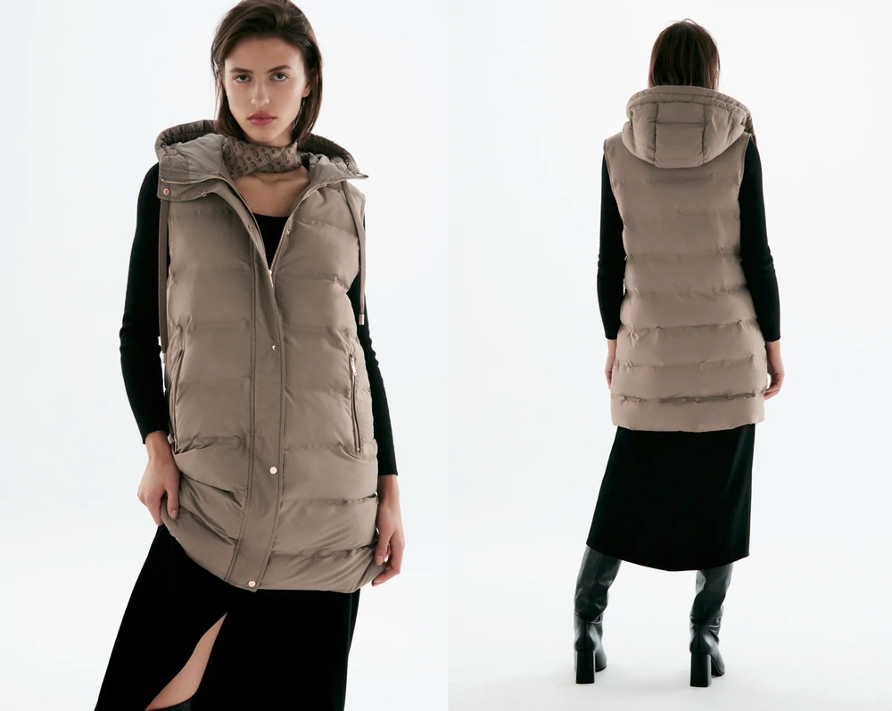 Un chaleco largo, acolchado, con capucha y cordones, cuello subido, manga de sisa, cierre con cremallera y botones metálicos, bolsillos delanteros con cremallera y forro interno. Todo fabricado con fibras de poliéster en su totalidad.