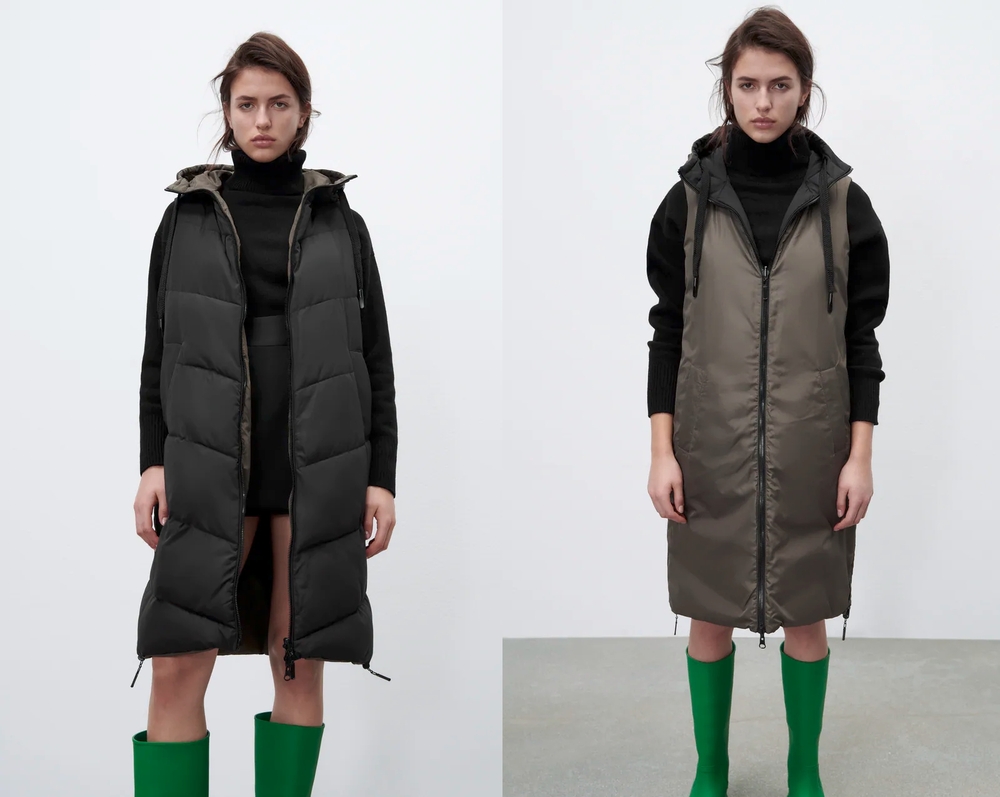 Este chaleco es reversible y lo tienes en Zara por 49,95€. Se puede usar por su lado acolchado con tono negro, y por su lado interno liso color verde. Por supuesto, está disponible en varias tallas para elegir. Un abrigo 2 en 1, para cambiar tu look sin cambiar de prenda.
