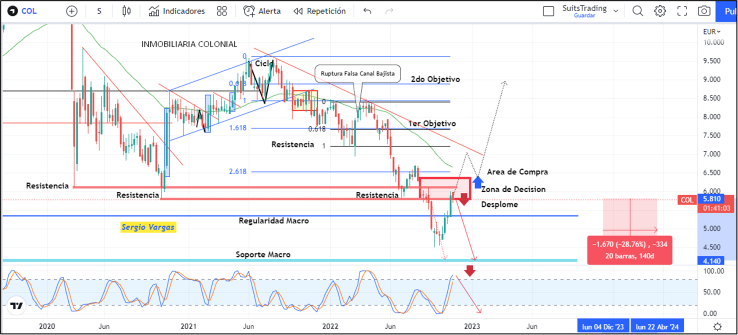 El precio se encuentra justo frenado por la resistencia macro mensual correspondiente a los mínimos creados por la pandemia en octubre de 2020 en 5,80 euros, ese nivel es supremamente diciente para las acciones de la Socimi en especial, por que a tan solo unos centavos más (6,10 euros) logrados en marzo de 2020, se creó la resistencia en confluencia con el área de regularidad del mercado, por lo tanto, hasta que no se recuperen niveles de 6,5 euros, no es recomendable adquirir acciones de Colonial ya que bajo los niveles actuales, la presión bajista sigue predominando y la lastrara hasta un -28%.
