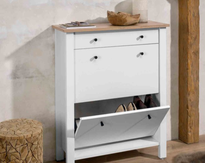 Este mueble nos recuerda mucho a algún modelo de IKEA, y tiene la ventaja de ser un mueble estrecho pero en el que nos caben unos cuantos pares de zapatos. Además, la combinación de madera natural y color blanco encaja fácilmente en todos los estilos decorativos.