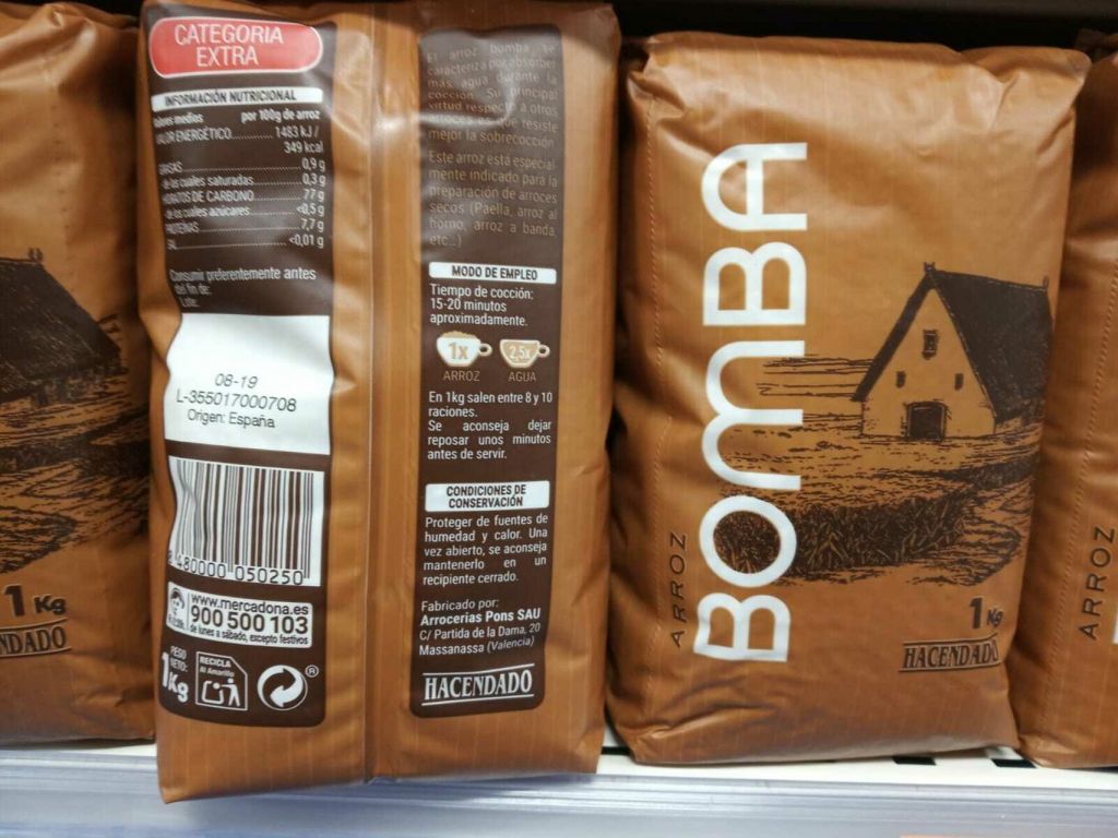 El arroz bomba de Mercadona tiene procedencia valenciana, en concreto de Arrocerías Pons y es uno de los arroces más valorados probablemente por su relación calidad-precio. Además, es uno de los productos más vendidos del supermercado valenciano. Su precio de 2,65 euros/kilo hace que no tenga competencia.
