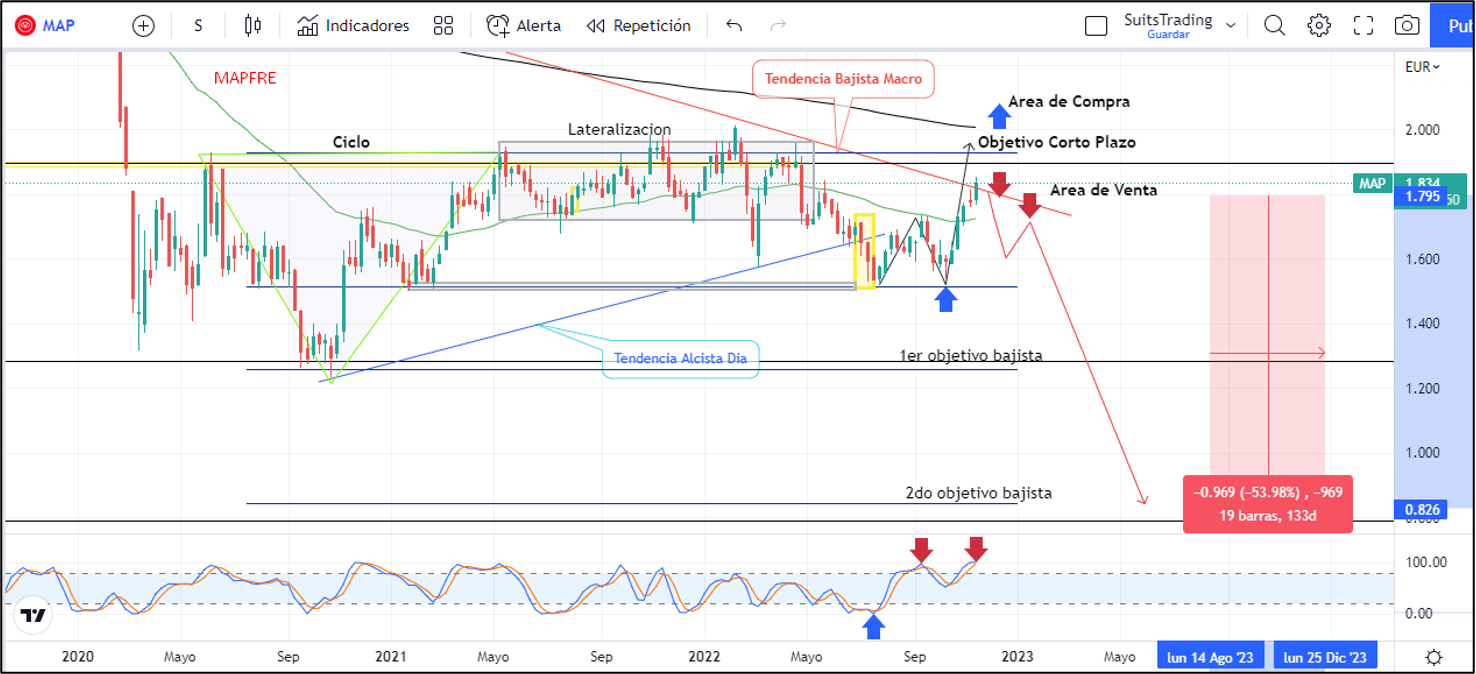 Las acciones de Mapfre se han revalorizado un 13,2% desde nuestro precio de compra establecido en 1,63 euros el cual compartimos con nuestros lectores en el anterior artículo publicado el pasado 26 de octubre denominado «Mapfre se puede aprovechar el corto plazo antes de su estocada final». En aquella ocasión aseveramos la probable revalorización entre el 12 y el 20% desde aquel precio, con un porcentaje de inversión en riesgo equivalente al 30% de lo que generalmente solemos utilizar, debido a la estructura macro histórica que las acciones de Mapfre enfrentan desde 2017 en consecuencia con un patrón bajista general.