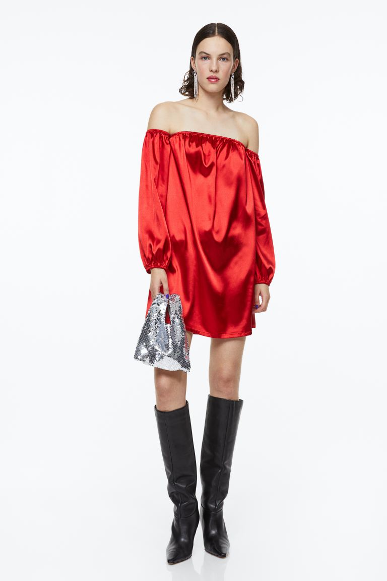 Es un vestido corto tipo evasé, confeccionado en un satén ligeramente drapeado. Una prenda que deja tus hombros completamente al aire y que se remata con unas mangas globo largas con elástico en el puño. El escote también tiene elástico, para conseguir un mejor ajuste.