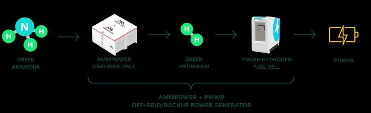 AmmPower se centra en el desarrollo de tecnología para convertir el amoníaco verde en hidrógeno verde, un proceso denominado «craqueo» del amoníaco. Con esta tecnología de craqueo, el hidrógeno puede almacenarse y transportarse de forma segura por todo el mundo como amoníaco y, al llegar a su destino, volver a convertirse en hidrógeno para un uso final más limpio y eficiente. PWWR está desarrollando sistemas de pilas de combustible de hidrógeno de bajo coste para los mercados mundiales, que pueden convertir el hidrógeno en electricidad con cero emisiones de CO2.