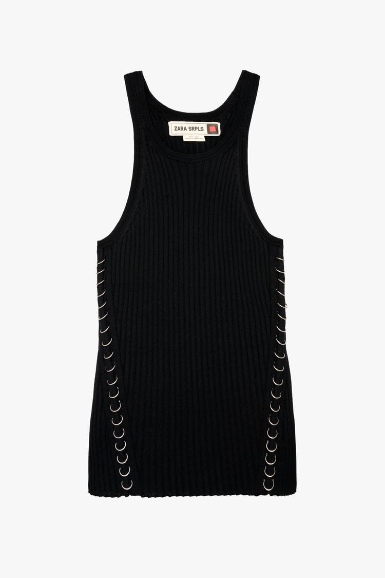Si quieres un top fresco y atrevido con el te puedes sentir elegante a la par que sexy esta prenda es la indicada para ti. Este top está confeccionado en algodón 100%. Cuenta con un cuello redondo y tirantes anchos. Además tiene el detalle de la aplicación de anillos metálicos. Esta prenda es perfecta para combinarla tanto con un vaquero como con una falda igual de atrevida lo que la convierte en una prenda bastante versátil a la hora de vestir. Puedes encontrarla por un valor de 39,95 euros y si su color negro no te convence también puedes adquirirla en tono gris.