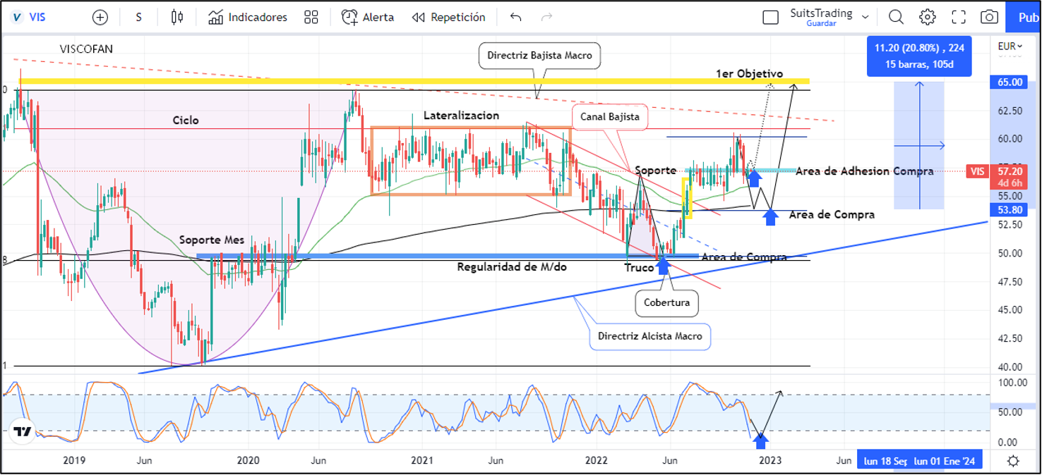 La situación macroeconómica sigue siendo hostil de cara a la mayoría de las empresas, pero hemos de remarcar que las empresas del sector de los alimentos, como pasa con Viscofan, suelen aguantar de mejor manera las crisis económicas mundiales y así lo dejó ver con la entrega de los resultados de los 9 primeros meses de 2022. Ahora bien, el escenario ideal para nuestra inversión en Viscofan estaría dado con el retroceso a los 53,8 euros en confluencia con el índice de fuerza relativa en niveles extremos de sobreventa que se diera antes del 21 de diciembre o mejor unos 3 a 5 días antes de la fecha máxima para adquirir las acciones con derecho a dividendo ya que esta práctica suele generar volatilidad previa.