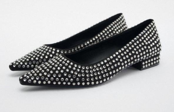 Por último, te mostramos estos zapatos planos tipo bailarina de Zara, con detalle de cristales. Vienen con acabado en punta y la altura de la suela es de 2 cm. También viene con plantilla técnica flexible de espuma compuesta de látex, diseñada para ofrecer un mayor confort. Los consigues en color negro, en las tallas del 35 al 42. El precio de venta es de 49,95 euros.