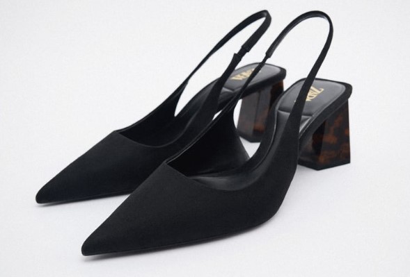 Este es otro zapato de tacón ancho destalonado de Zara, estilo salón en tejido. Tiene acabado en punta y tira trasera con pieza elástica. El tacón es con efecto carey y la altura es de 6,5 cm. Viene con plantilla técnica flexible de espuma compuesta de látex, diseñada para ofrecer un mayor confort. Los consigues en color negro, en las tallas del 35 al 42. El precio de venta es de 29,95 euros.