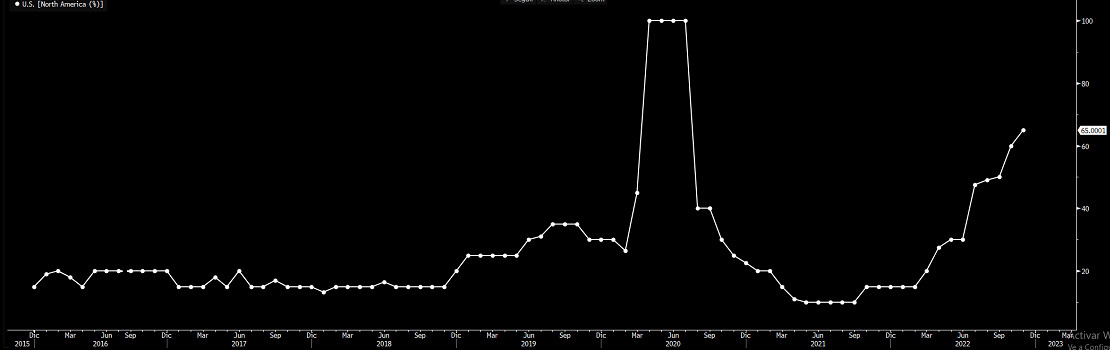 Este indicador, además, también muestra la cercanía de la recesión. Siguiendo la sucesión de las seis recesiones de los últimos 50 años, una vez superado el 70% tan sólo pasan entre tres y seis meses para que esta grave situación económica se manifieste en la economía real. Además de la curva de tipos invertida, la probabilidad de una recesión se ha disparado hasta el 65% en EE UU, siendo una de las lecturas adelantadas más altas registradas en los últimos años, tan sólo superada por la recesión de marzo de 2020 por la pandemia de coronavirus.