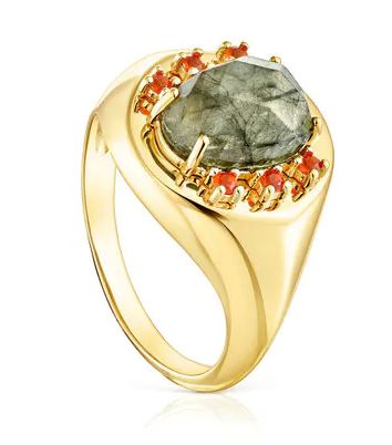 El siguiente anillo de Tous es este sello de plata vermeil. Para seguir con esta colección, tenemos una labradorita de 11 x 7 mm y 6 cornalinas engastadas en los laterales, para simular un insecto. El grosor del anillo es de 1,5 mm, mientras que su anchura es de 13 mm.