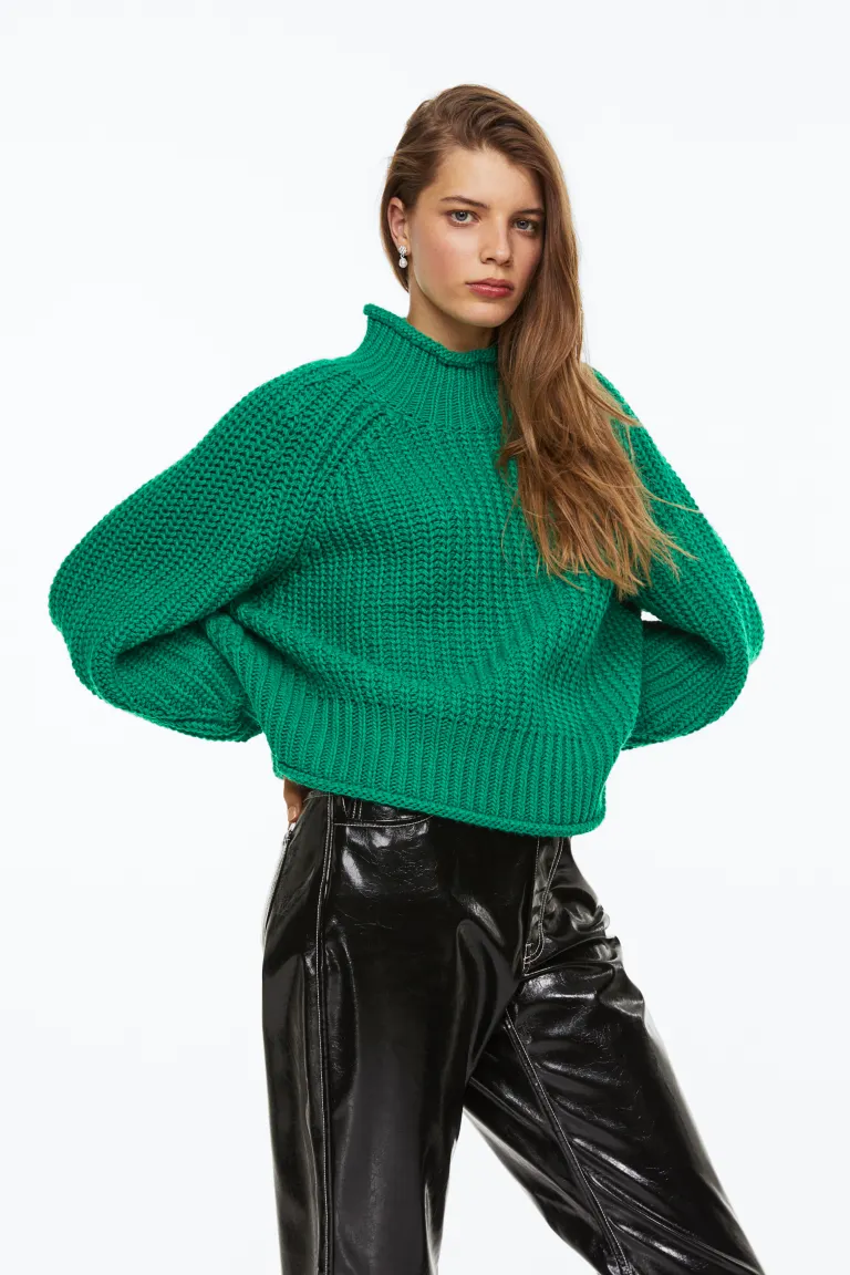 Aquí te traemos este fantástico jersey de punto suave con lana en la trama. Es un modelo de corte cuadrado con mangas raglán, cuello perkins enrollado y ribete ancho enrollado en punto elástico en puños y bajo. Lo mejor de todo es que el 50% de este jersey está hecho de poliéster reciclado por lo que ayudarás al medio ambiente con él. Podrás adquirirlo tanto en tienda física como en la web por un precio de 24,99 euros. Si el verde oscuro no es tu color, no te preocupes, ya que está disponible en otros tonos como: Beige grisáceo, lila claro (los cuales están rebajados y cuesta 12,99 euros), negro, turquesa, verde claro y naranja.