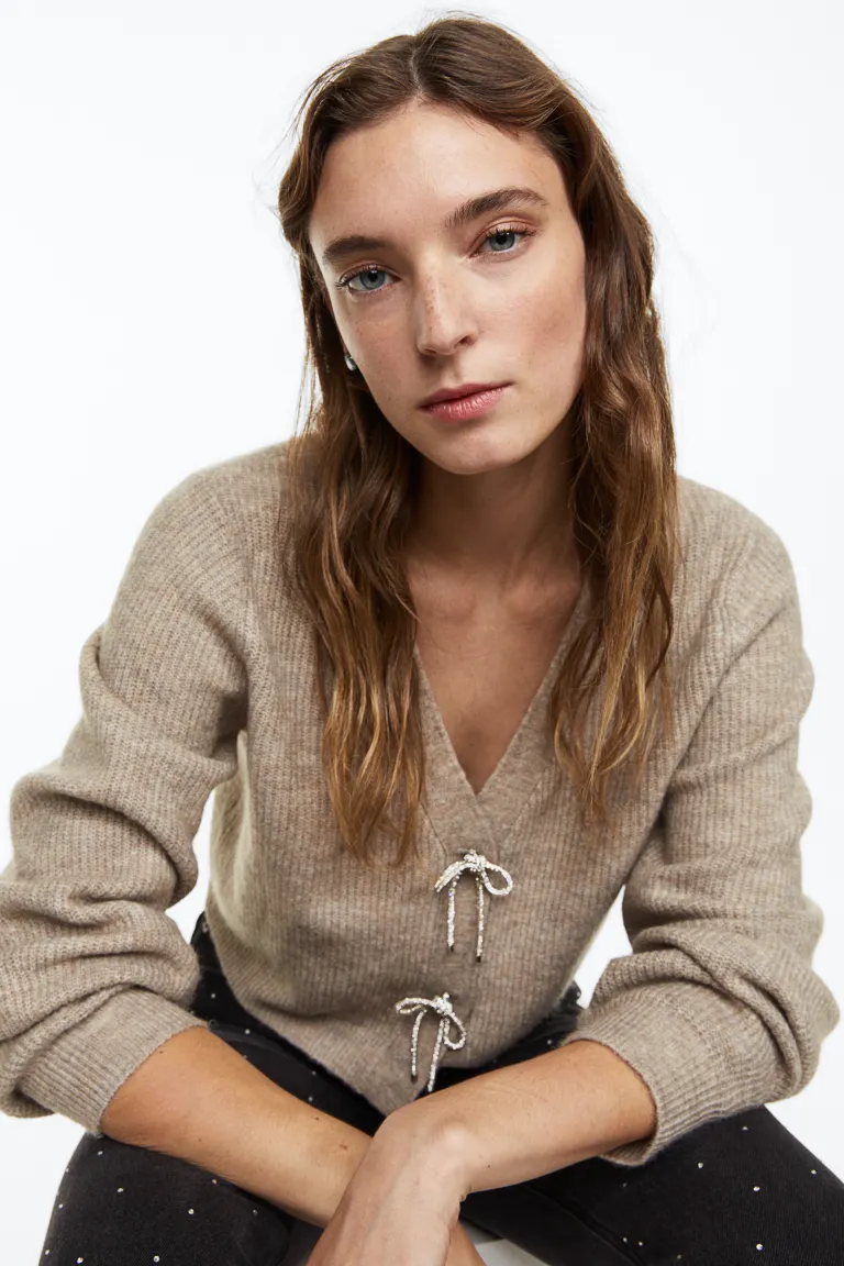 6Cárdigan en punto de canalé con lazos de strass