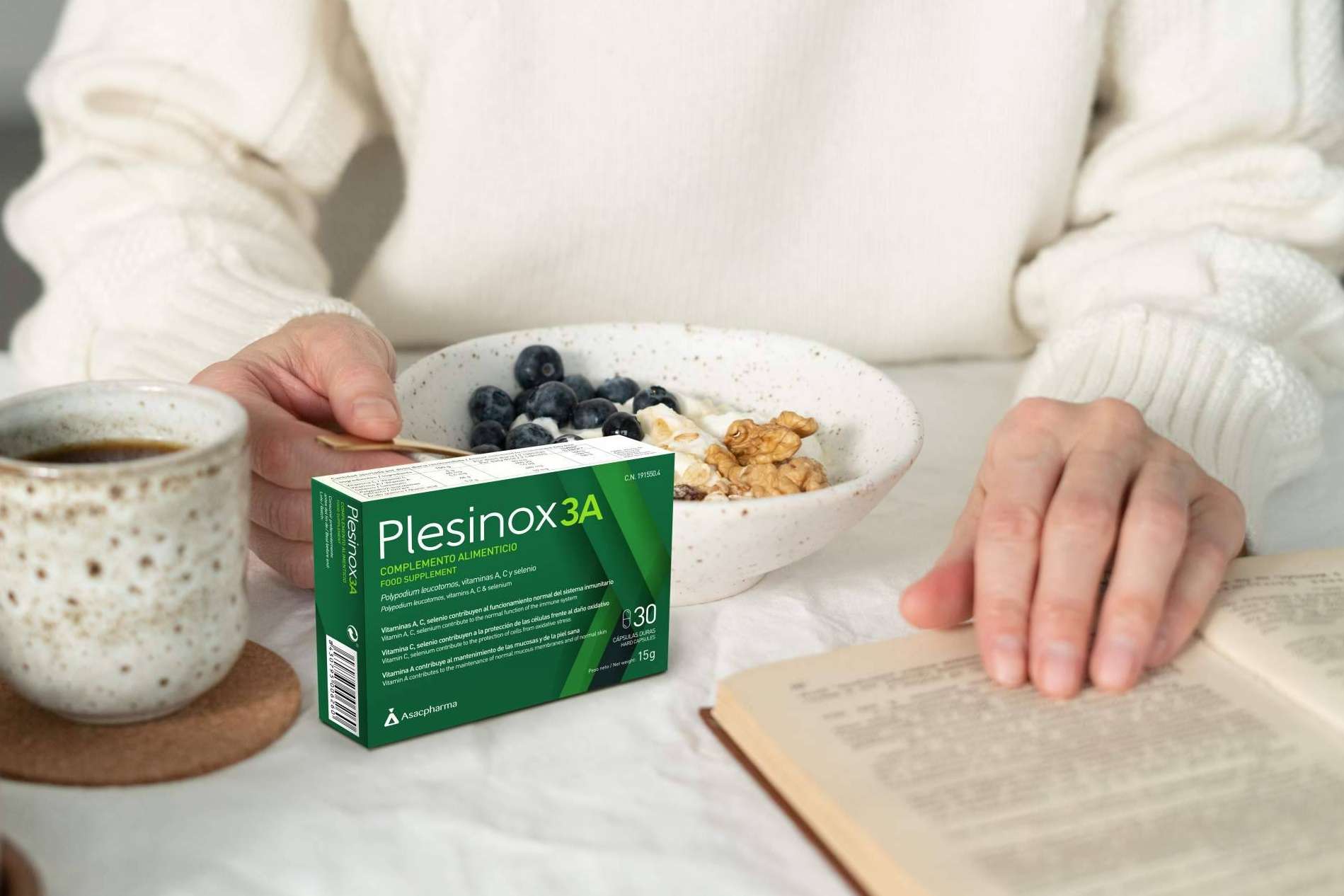 Plesinox 3A es ideal para reforzar la función inmune, ya que ofrece una triple acción efectiva que ayuda al organismo a equilibrarse y mantener una buena salud. Este suplemento está compuesto por principios activos a base de extracto de Polypodium leucotomos (EPL), vitamina A, vitamina C y selenio, cuyas propiedades ayudan a reforzar las defensas y a fortalecer el sistema inmunitario. La vitamina C y el selenio, por su parte, contribuyen a la protección de las células del daño oxidativo, y la vitamina A favorece el mantenimiento de una piel sana y de las mucosas.