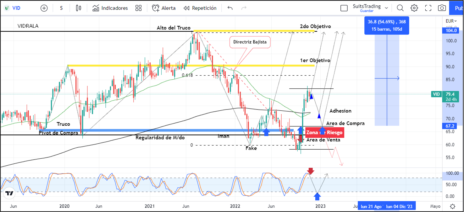 Parece un recorrido largo hasta el cumplimiento de ese objetivo, sin embargo, la fuerza que lo acompaña puede llevarlo a cumplirlo antes de mitad del próximo año. Lo ideal para esta posición es aprovechar el máximo de potencial que tiene la acción de Vidrala con lo cual, realizaremos adhesiones a las compras en cada retroceso del precio donde confluyen niveles de soporte o medias móviles con áreas de regularidad de mercado, es decir, en el 61,8 de retroceso de Fibonacci de cada extensión. De esta forma, podemos estimar la decisión de compra por encima de los 72,8 euros al visitar y respetar las medias móviles o incluso si visita nuevamente los 67,8 euros correspondientes a la regularidad del último avance.