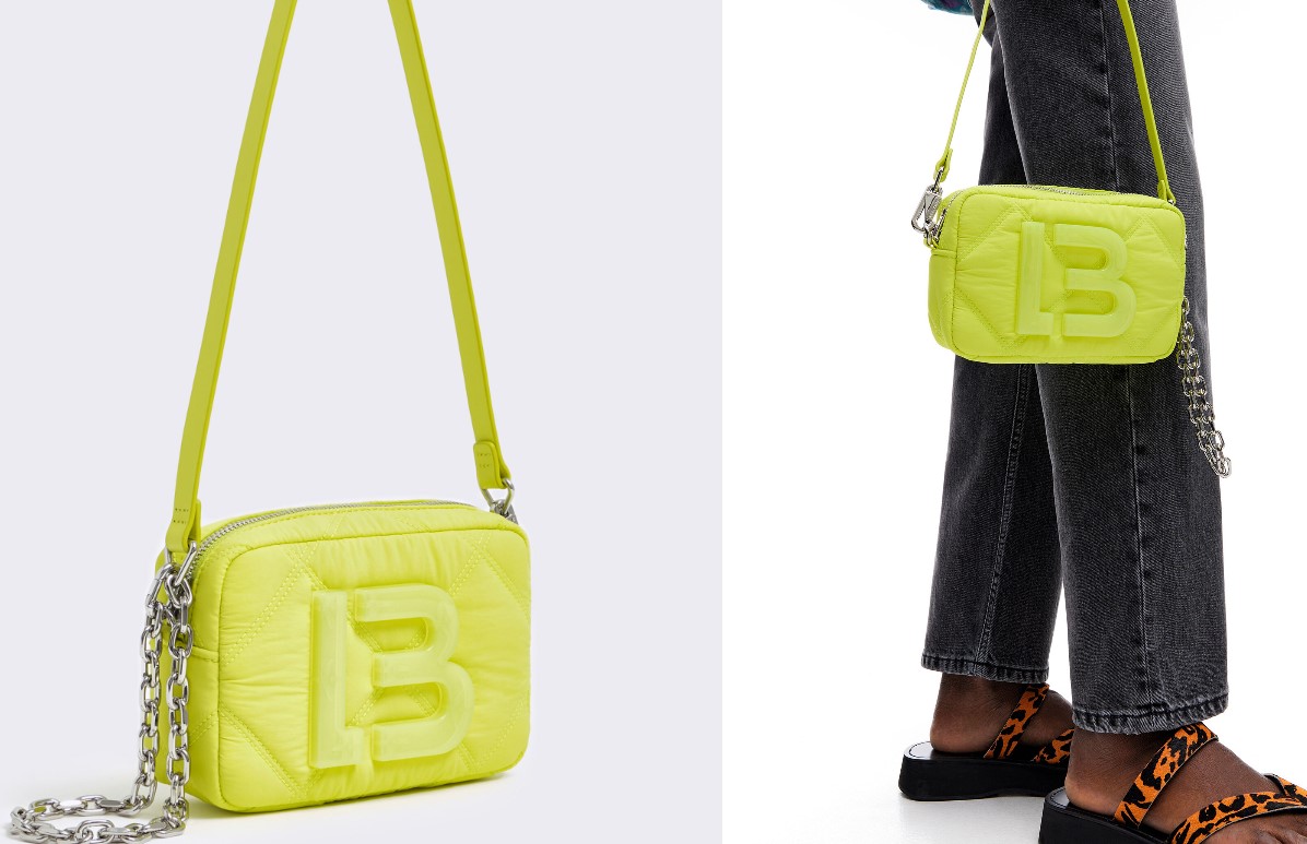 Este es otro bolso bandolera de Bimba y Lola en nylon acolchado color lima. El modelo es de tamaño pequeño con cierre de cremallera y asa bandolera de cadena y piel. El exterior está personalizado con logo LB. Sus medidas son 20 x 13,5 x 5,5 cm. Actualmente, tiene un descuento del 30%, por lo que puede ser tuyo por 84 euros.
