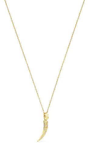 Viene en oro de 18 quilates y 1,786 gramos y 14 diamantes talla single cut de 0,06 ct. En cuanto al cuerno, mide 1,5 cm de un total de 42 cm de longitud. El precio del collar normalmente es de 390 euros; sin embargo, se ha quedado en 234 euros por el descuento del 40%. Lo puedes pagar en 3 pagos de 78 euros. Tienes una versión solo de oro que ha pasado de costar 220 euros a costar 132.