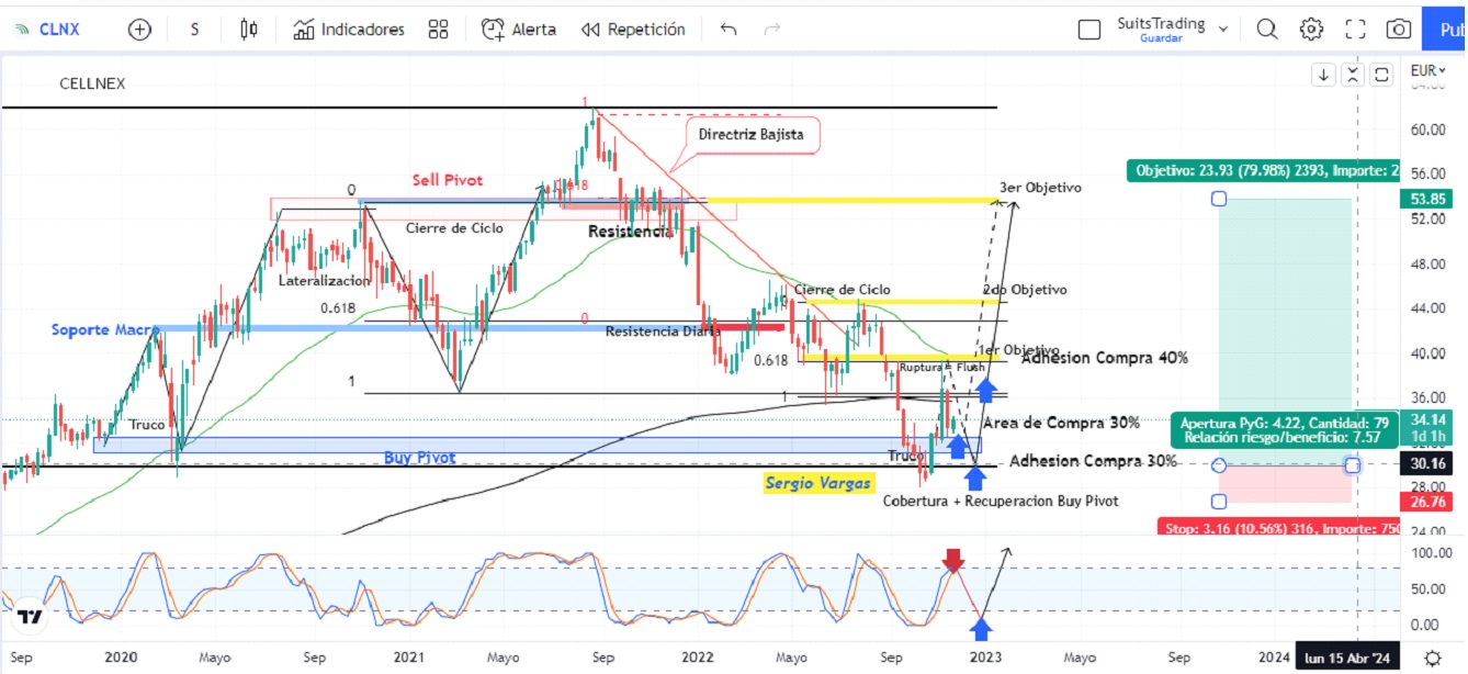 Para poder cubrir la posición y aprovechar al mismo tiempo la oportunidad, vamos a ingresar de manera escalonada con un 30% de inversión en niveles actuales de manera tal que, ante un mayor retroceso, no vulnere el área de regularidad establecida en niveles de 29,7 euros.