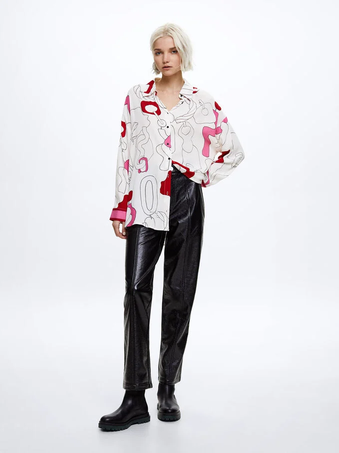 Comenzamos con esta camisa con estampado y fondo de color crudo. Es una camisa estampada, con cuello de solapa y cierre delantero con botones, todo en manga larga. La composición es única, estando compuesta al 100% por viscosa.
