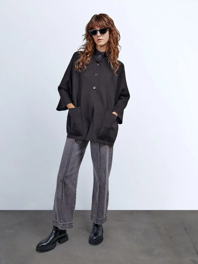 La última prenda de las rebajas Black Friday de Parfois es este poncho de punto de cuello alto. Tiene manga de ¾, cierre frontal con botones y dos bolsillos en la parte delantera. Su composición es mixta, con un mix compuesto por un 48% viscosa, un 28% poliéster y un 24% poliamida.