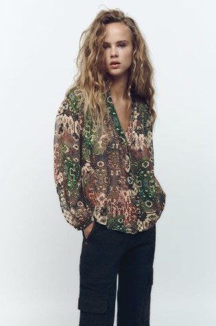 Esta es otra blusa de Zara estampada, de escote en pico y manga larga. Cuenta con detalle de hilo metalizado y el cierre es frontal con botones dorados. Está confeccionada en 99% poliéster y 1% fibra metalizada de poliéster, y la consigues en las tallas que van desde el XS al XL. Puedes llevártela a casa por el precio de 25,95 euros.