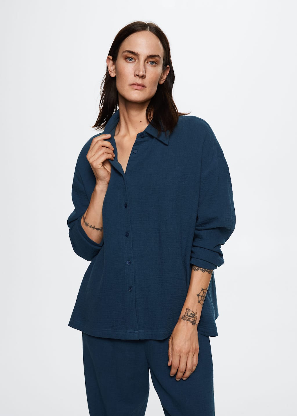 Una chaqueta de pijama confeccionada totalmente en algodón con un tejido muy fluido. Un diseño recto y largo que no te aprieta nada y que cuenta con cuello camisero y cierre mediante botones.